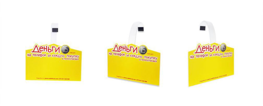 Одна из наиболее актуальных и востребованных услуг нашей типографии – изготовление воблеров. Рекламный воблер поможет заметно и ярко заявить о скидках, акциях или горящих ценах. С его помощью легко выделить продукцию среди множества товаров других фирм и обратить внимание потенциального покупателя на её особенности. Само понятие «воблер», как ни странно, пришло в мир рекламы из рыболовной экипировки — так называют яркую наживку для рыбы. Как и рыболовные, рекламные воблеры используются для того, чтобы привлечь внимание, но уже не рыбы к наживке, а покупателя к товару. Это своего рода рекламная табличка, которая изготавливается из плотной бумаги, картона либо пластика с ножкой для крепления на товар, витрину или кассу. Несмотря на небольшой вес, конструкция изделия довольно надежна — он способен провисеть в магазине до года.